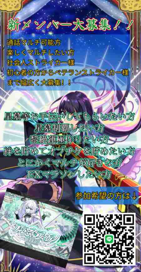 星墓制覇したい方、黎絶運極作りたい方、毎月オブチケ40枚貯めたい方、とにかくマルチが好きな方は是非是非当グルへ(@'ω'@)