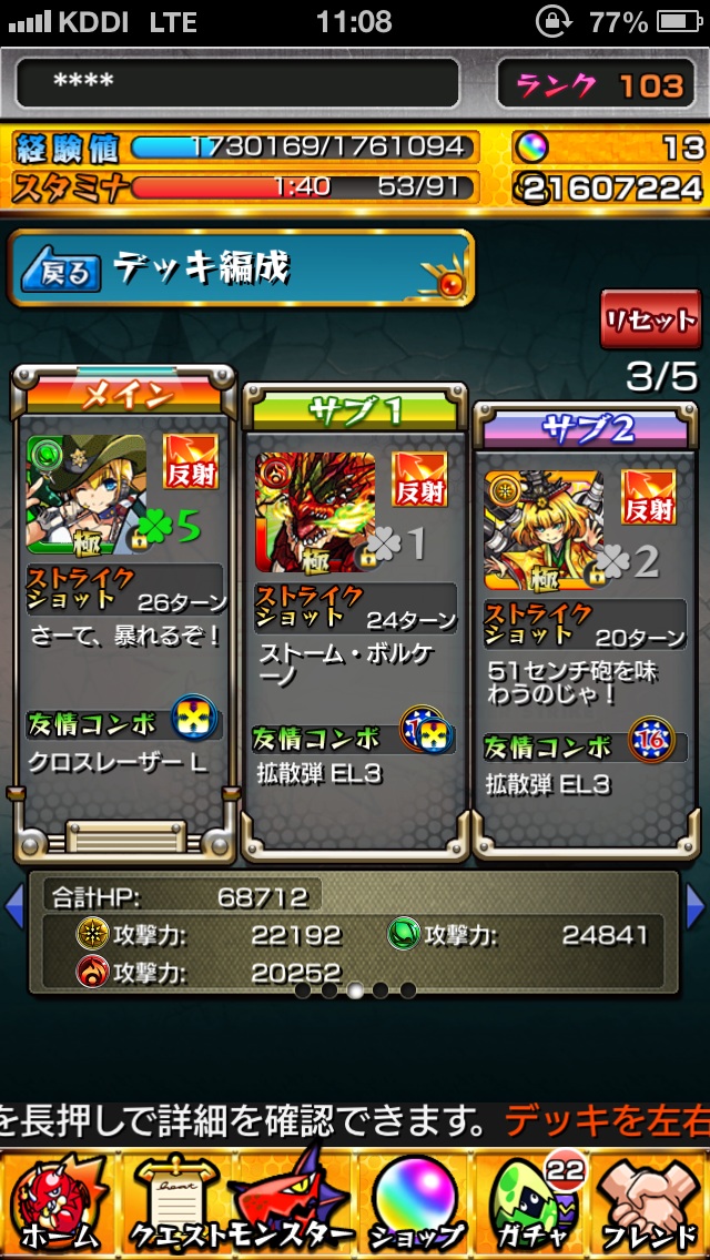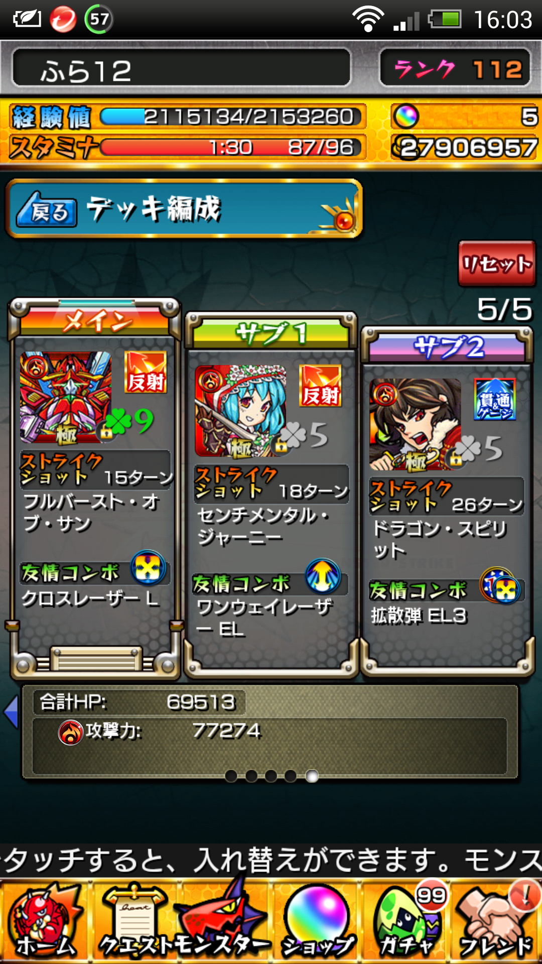 火属性で友情コンボがワンウェイレーザーのためボスや雑魚に非常に有効でした。ダメージウォールが発生するためアンチダメージウォールは役に立った。